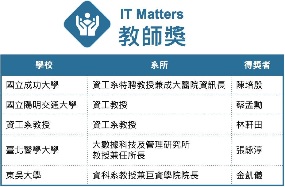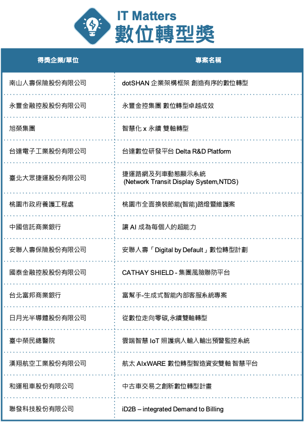 教師獎」,以及新增的「數位轉型獎」與「社會影響力產品/專案獎」,表彰在數位轉型及社會影響力方面表現卓越的企業與專案。