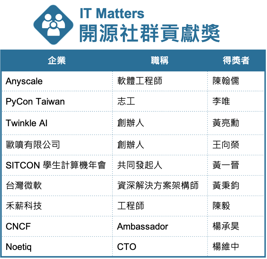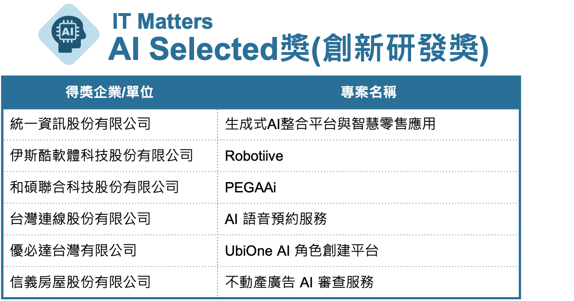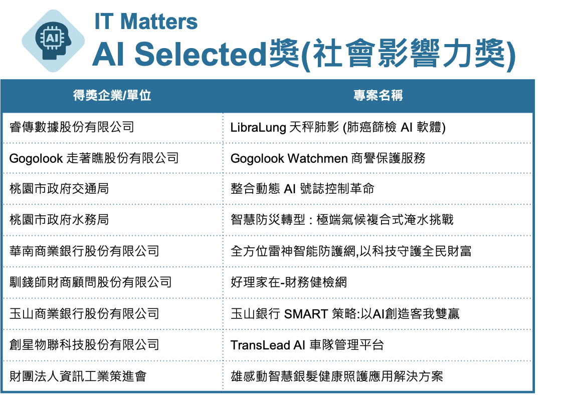 IT Matters Awards 旨在表揚對 IT 領域具卓越貢獻的企業、專案、產品與個人,推動產業升級與數位創新,強化台灣在全球科技版圖的影響力。2025 年IT Matters Awards邁入第三屆,並進一步升格由數位發展部指導,展現政府對數位產業的高度重視與支持。今年特別新增「AI Selected 獎」與「開源社群貢獻獎」,聚焦人工智慧與開源技術的創新應用,深化台灣與全球科技生態系的連結,助力台灣在數位世界中發光發熱、開拓未來新局。